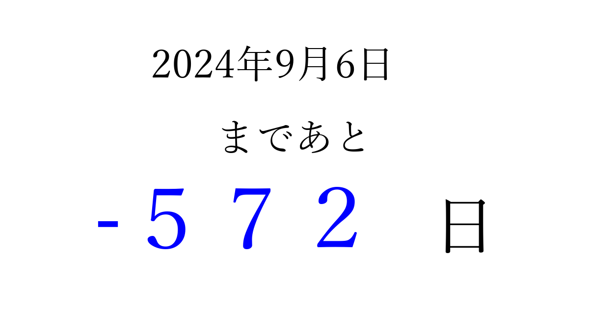 2024年9月6日(金)は もう 000 日過ぎました 追加すると、トップページからすぐ選べるようになります ※2026/04/01現在の結果です。 最新の状態に更新する ↓シェアして、タイムライン上にカウントダウンを表示しよう!↓ 📤 この結果を共有する Tweet シェア Threads Bluesky 別の日付でカウントダウン 2024年9月のカレンダー このページをブックマークに追加すると、いつでもカウントダウンを確認できます。 (PC: Ctrl+D / Mac: ⌘+D) hitome-notes.comでは以下のページも運営しています。 指定日と期間から日付を計算 | ガチャ確率計算・シミュレーション | プライバシー・ポリシー 運営者:Avocado