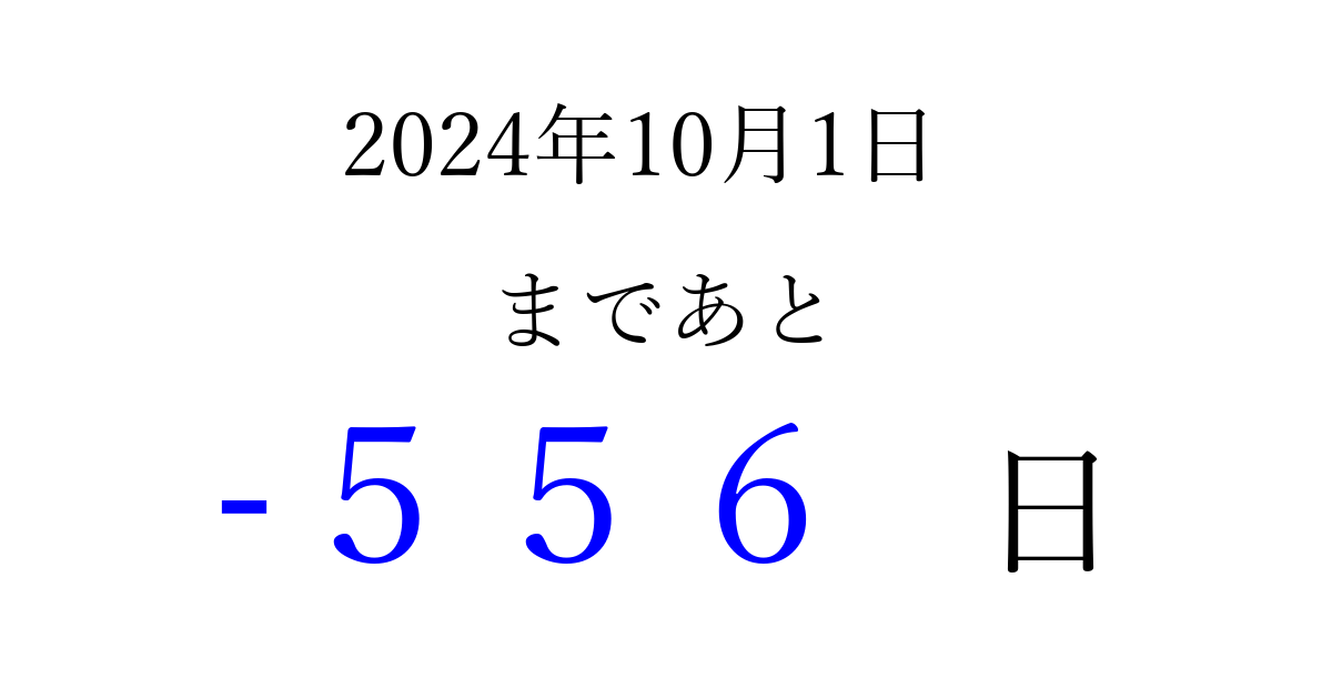 2024年10月1日(火)は もう 000 日過ぎました 追加すると、トップページからすぐ選べるようになります ※2026/04/10現在の結果です。 最新の状態に更新する ↓シェアして、タイムライン上にカウントダウンを表示しよう!↓ 📤 この結果を共有する Tweet シェア Threads Bluesky 別の日付でカウントダウン 2024年10月のカレンダー このページをブックマークに追加すると、いつでもカウントダウンを確認できます。 (PC: Ctrl+D / Mac: ⌘+D) hitome-notes.comでは以下のページも運営しています。 指定日と期間から日付を計算 | ガチャ確率計算・シミュレーション | プライバシー・ポリシー 運営者:Avocado
