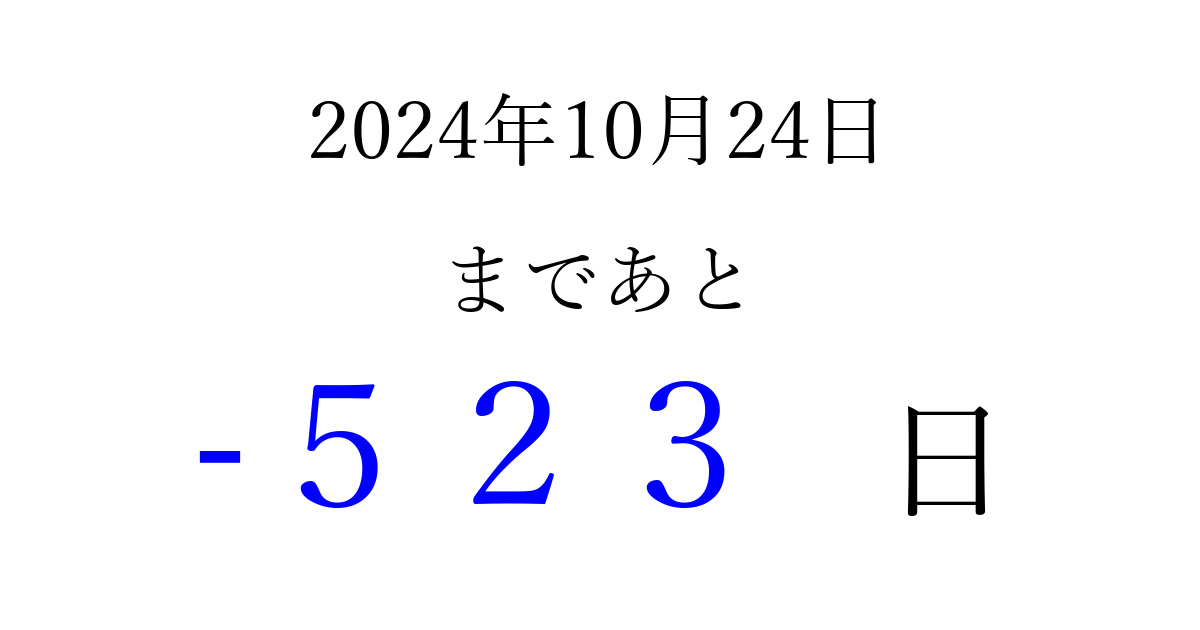 2024年10月24日(木)は もう 000 日過ぎました 追加すると、トップページからすぐ選べるようになります ※2026/03/31現在の結果です。 最新の状態に更新する ↓シェアして、タイムライン上にカウントダウンを表示しよう!↓ 📤 この結果を共有する Tweet シェア Threads Bluesky 別の日付でカウントダウン 2024年10月のカレンダー このページをブックマークに追加すると、いつでもカウントダウンを確認できます。 (PC: Ctrl+D / Mac: ⌘+D) hitome-notes.comでは以下のページも運営しています。 指定日と期間から日付を計算 | ガチャ確率計算・シミュレーション | プライバシー・ポリシー 運営者:Avocado
