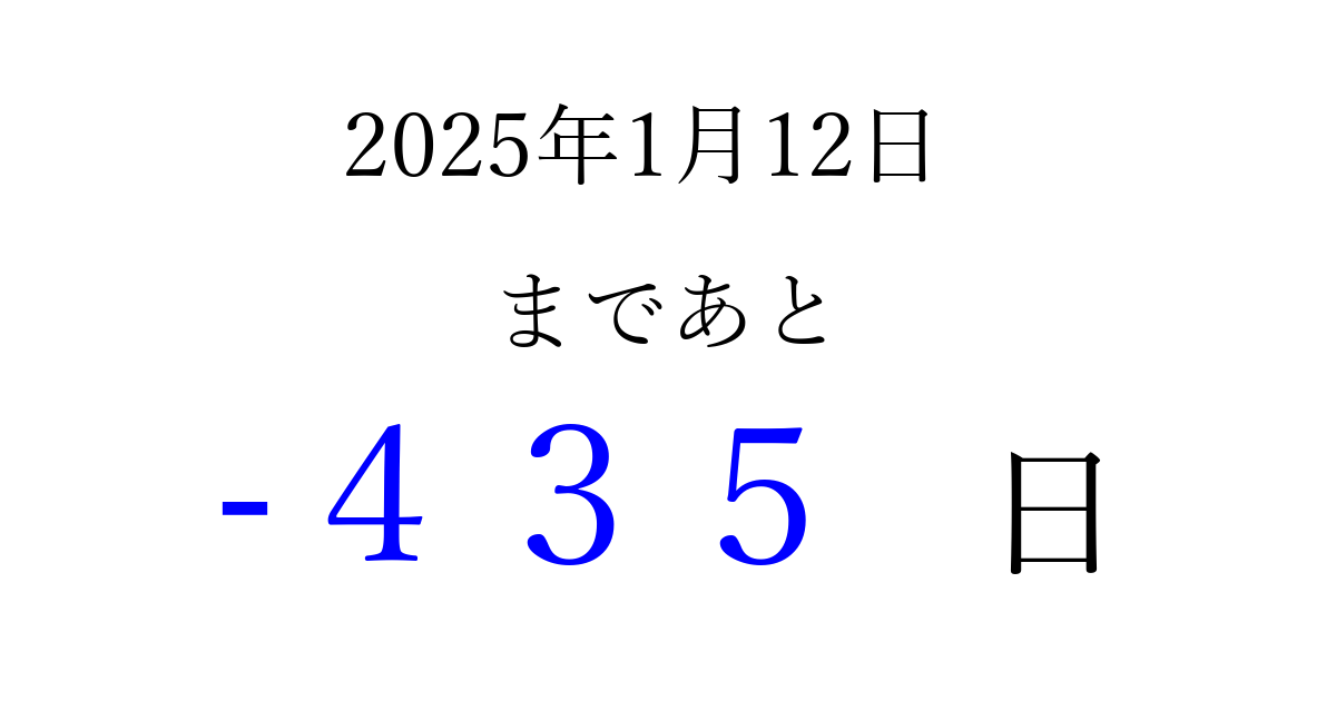 2025年1月12日(日)は もう 000 日過ぎました 追加すると、トップページからすぐ選べるようになります ※2026/03/23現在の結果です。 最新の状態に更新する ↓シェアして、タイムライン上にカウントダウンを表示しよう!↓ 📤 この結果を共有する Tweet シェア Threads Bluesky 別の日付でカウントダウン 2025年1月のカレンダー このページをブックマークに追加すると、いつでもカウントダウンを確認できます。 (PC: Ctrl+D / Mac: ⌘+D) hitome-notes.comでは以下のページも運営しています。 指定日と期間から日付を計算 | ガチャ確率計算・シミュレーション | プライバシー・ポリシー 運営者:Avocado