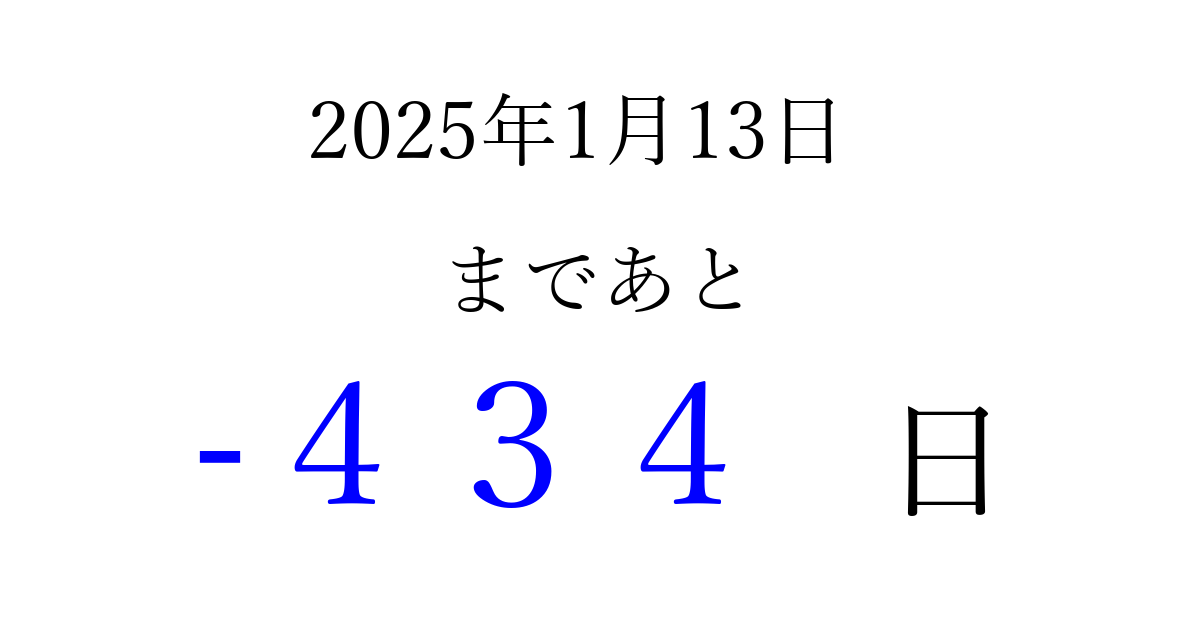 2025年1月13日(月)は もう 000 日過ぎました 追加すると、トップページからすぐ選べるようになります ※2026/03/23現在の結果です。 最新の状態に更新する ↓シェアして、タイムライン上にカウントダウンを表示しよう!↓ 📤 この結果を共有する Tweet シェア Threads Bluesky 別の日付でカウントダウン 2025年1月のカレンダー このページをブックマークに追加すると、いつでもカウントダウンを確認できます。 (PC: Ctrl+D / Mac: ⌘+D) hitome-notes.comでは以下のページも運営しています。 指定日と期間から日付を計算 | ガチャ確率計算・シミュレーション | プライバシー・ポリシー 運営者:Avocado