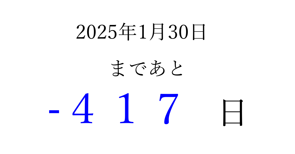 2025年1月30日(木)は もう 000 日過ぎました 追加すると、トップページからすぐ選べるようになります ※2026/03/23現在の結果です。 最新の状態に更新する ↓シェアして、タイムライン上にカウントダウンを表示しよう!↓ 📤 この結果を共有する Tweet シェア Threads Bluesky 別の日付でカウントダウン 2025年1月のカレンダー このページをブックマークに追加すると、いつでもカウントダウンを確認できます。 (PC: Ctrl+D / Mac: ⌘+D) hitome-notes.comでは以下のページも運営しています。 指定日と期間から日付を計算 | ガチャ確率計算・シミュレーション | プライバシー・ポリシー 運営者:Avocado