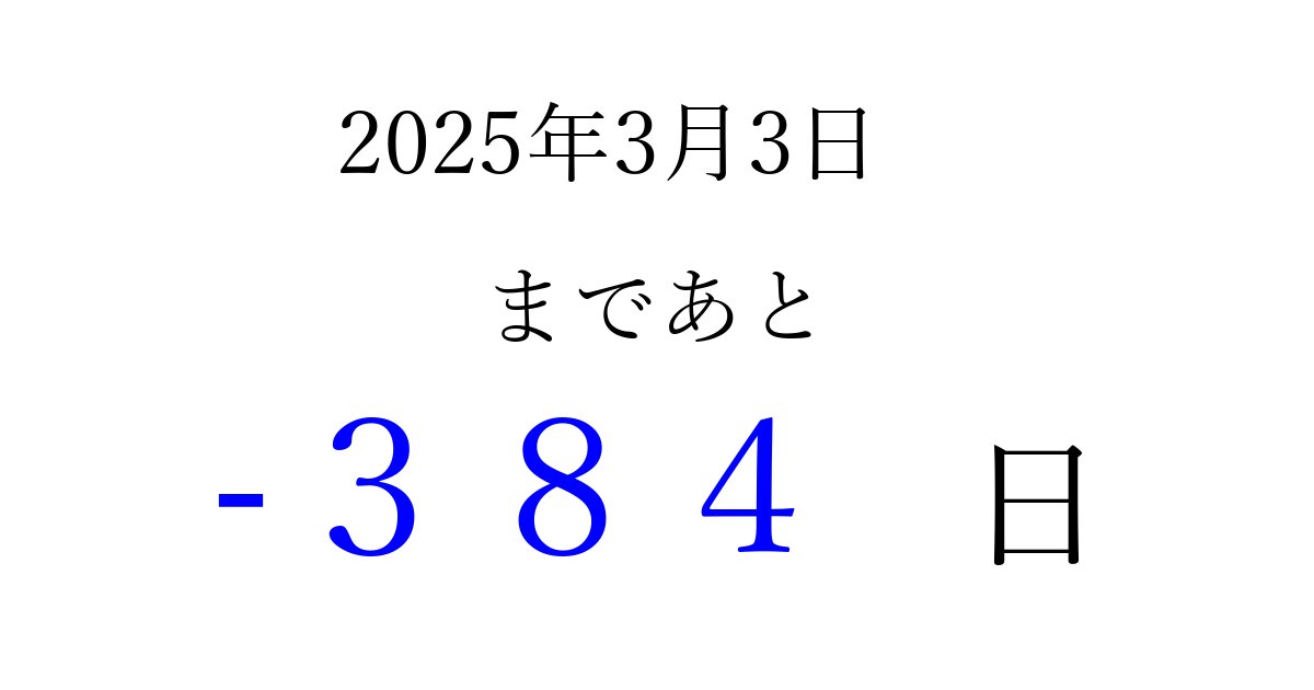 2025年3月3日(月)は もう 000 日過ぎました 追加すると、トップページからすぐ選べるようになります ※2026/03/22現在の結果です。 最新の状態に更新する ↓シェアして、タイムライン上にカウントダウンを表示しよう!↓ 📤 この結果を共有する Tweet シェア Threads Bluesky 別の日付でカウントダウン 2025年3月のカレンダー このページをブックマークに追加すると、いつでもカウントダウンを確認できます。 (PC: Ctrl+D / Mac: ⌘+D) hitome-notes.comでは以下のページも運営しています。 指定日と期間から日付を計算 | ガチャ確率計算・シミュレーション | プライバシー・ポリシー 運営者:Avocado