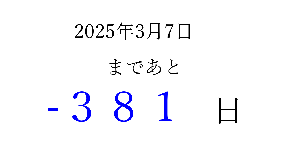 2025年3月7日(金)は もう 000 日過ぎました 追加すると、トップページからすぐ選べるようになります ※2026/03/23現在の結果です。 最新の状態に更新する ↓シェアして、タイムライン上にカウントダウンを表示しよう!↓ 📤 この結果を共有する Tweet シェア Threads Bluesky 別の日付でカウントダウン 2025年3月のカレンダー このページをブックマークに追加すると、いつでもカウントダウンを確認できます。 (PC: Ctrl+D / Mac: ⌘+D) hitome-notes.comでは以下のページも運営しています。 指定日と期間から日付を計算 | ガチャ確率計算・シミュレーション | プライバシー・ポリシー 運営者:Avocado