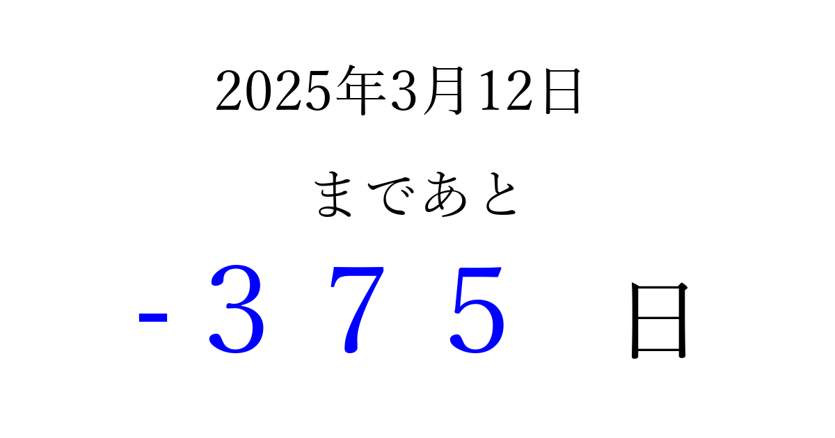 2025年3月12日(水)は もう 000 日過ぎました 追加すると、トップページからすぐ選べるようになります ※2026/03/22現在の結果です。 最新の状態に更新する ↓シェアして、タイムライン上にカウントダウンを表示しよう!↓ 📤 この結果を共有する Tweet シェア Threads Bluesky 別の日付でカウントダウン 2025年3月のカレンダー このページをブックマークに追加すると、いつでもカウントダウンを確認できます。 (PC: Ctrl+D / Mac: ⌘+D) hitome-notes.comでは以下のページも運営しています。 指定日と期間から日付を計算 | ガチャ確率計算・シミュレーション | プライバシー・ポリシー 運営者:Avocado