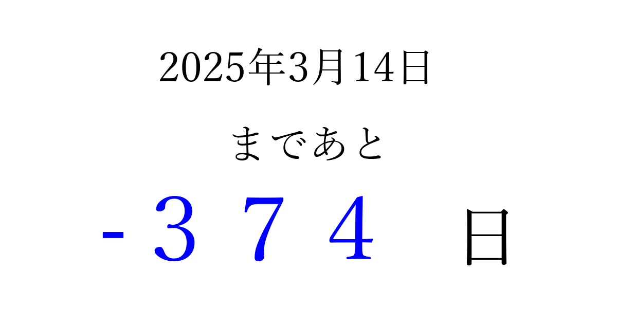 2025年3月14日(金)は もう 000 日過ぎました 追加すると、トップページからすぐ選べるようになります ※2026/03/23現在の結果です。 最新の状態に更新する ↓シェアして、タイムライン上にカウントダウンを表示しよう!↓ 📤 この結果を共有する Tweet シェア Threads Bluesky 別の日付でカウントダウン 2025年3月のカレンダー このページをブックマークに追加すると、いつでもカウントダウンを確認できます。 (PC: Ctrl+D / Mac: ⌘+D) hitome-notes.comでは以下のページも運営しています。 指定日と期間から日付を計算 | ガチャ確率計算・シミュレーション | プライバシー・ポリシー 運営者:Avocado