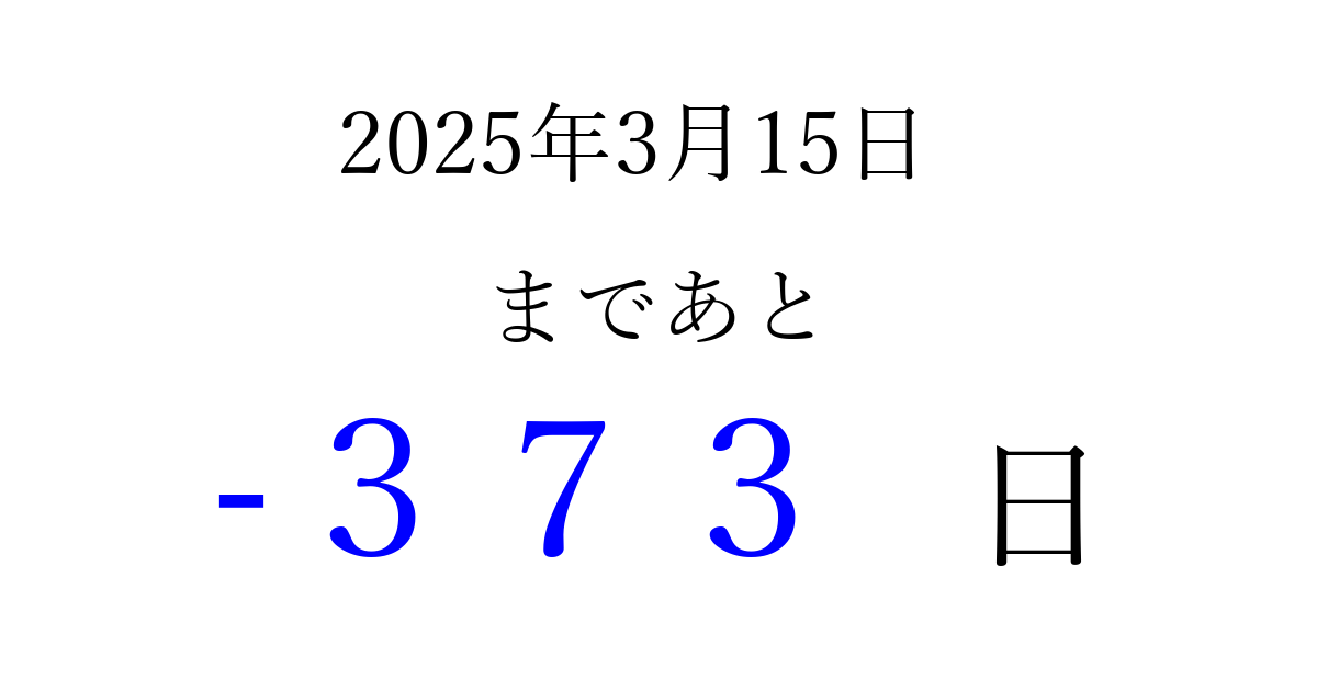 2025年3月15日(土)は もう 000 日過ぎました 追加すると、トップページからすぐ選べるようになります ※2026/03/23現在の結果です。 最新の状態に更新する ↓シェアして、タイムライン上にカウントダウンを表示しよう!↓ 📤 この結果を共有する Tweet シェア Threads Bluesky 別の日付でカウントダウン 2025年3月のカレンダー このページをブックマークに追加すると、いつでもカウントダウンを確認できます。 (PC: Ctrl+D / Mac: ⌘+D) hitome-notes.comでは以下のページも運営しています。 指定日と期間から日付を計算 | ガチャ確率計算・シミュレーション | プライバシー・ポリシー 運営者:Avocado