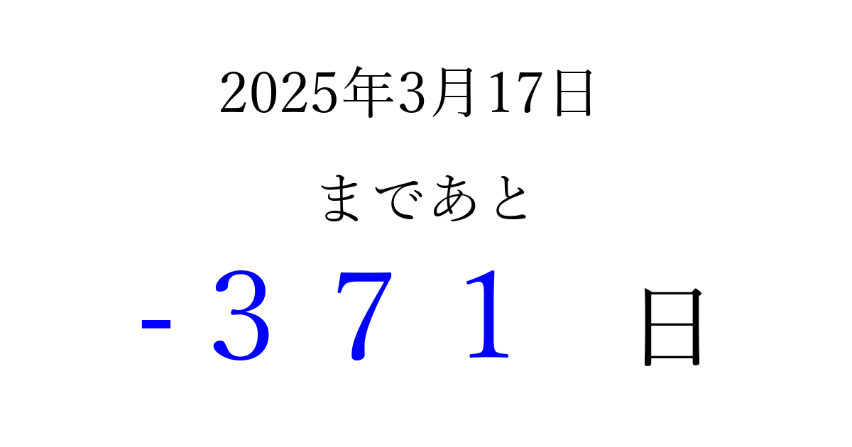 2025年3月17日(月)は もう 000 日過ぎました 追加すると、トップページからすぐ選べるようになります ※2026/03/23現在の結果です。 最新の状態に更新する ↓シェアして、タイムライン上にカウントダウンを表示しよう!↓ 📤 この結果を共有する Tweet シェア Threads Bluesky 別の日付でカウントダウン 2025年3月のカレンダー このページをブックマークに追加すると、いつでもカウントダウンを確認できます。 (PC: Ctrl+D / Mac: ⌘+D) hitome-notes.comでは以下のページも運営しています。 指定日と期間から日付を計算 | ガチャ確率計算・シミュレーション | プライバシー・ポリシー 運営者:Avocado