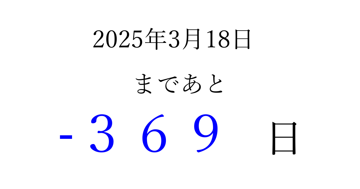 2025年3月18日(火)は もう 000 日過ぎました 追加すると、トップページからすぐ選べるようになります ※2026/03/22現在の結果です。 最新の状態に更新する ↓シェアして、タイムライン上にカウントダウンを表示しよう!↓ 📤 この結果を共有する Tweet シェア Threads Bluesky 別の日付でカウントダウン 2025年3月のカレンダー このページをブックマークに追加すると、いつでもカウントダウンを確認できます。 (PC: Ctrl+D / Mac: ⌘+D) hitome-notes.comでは以下のページも運営しています。 指定日と期間から日付を計算 | ガチャ確率計算・シミュレーション | プライバシー・ポリシー 運営者:Avocado