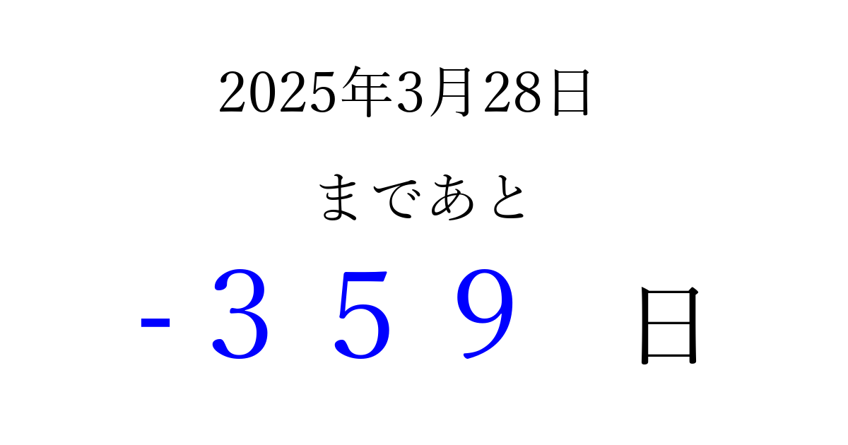 2025年3月28日(金)は もう 000 日過ぎました 追加すると、トップページからすぐ選べるようになります ※2026/03/22現在の結果です。 最新の状態に更新する ↓シェアして、タイムライン上にカウントダウンを表示しよう!↓ 📤 この結果を共有する Tweet シェア Threads Bluesky 別の日付でカウントダウン 2025年3月のカレンダー このページをブックマークに追加すると、いつでもカウントダウンを確認できます。 (PC: Ctrl+D / Mac: ⌘+D) hitome-notes.comでは以下のページも運営しています。 指定日と期間から日付を計算 | ガチャ確率計算・シミュレーション | プライバシー・ポリシー 運営者:Avocado