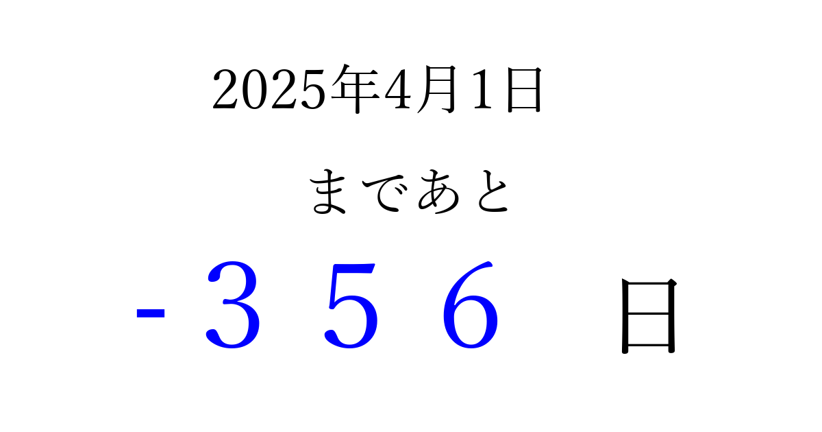 2025年4月1日(火)は もう 000 日過ぎました 追加すると、トップページからすぐ選べるようになります ※2026/03/23現在の結果です。 最新の状態に更新する ↓シェアして、タイムライン上にカウントダウンを表示しよう!↓ 📤 この結果を共有する Tweet シェア Threads Bluesky 別の日付でカウントダウン 2025年4月のカレンダー このページをブックマークに追加すると、いつでもカウントダウンを確認できます。 (PC: Ctrl+D / Mac: ⌘+D) hitome-notes.comでは以下のページも運営しています。 指定日と期間から日付を計算 | ガチャ確率計算・シミュレーション | プライバシー・ポリシー 運営者:Avocado