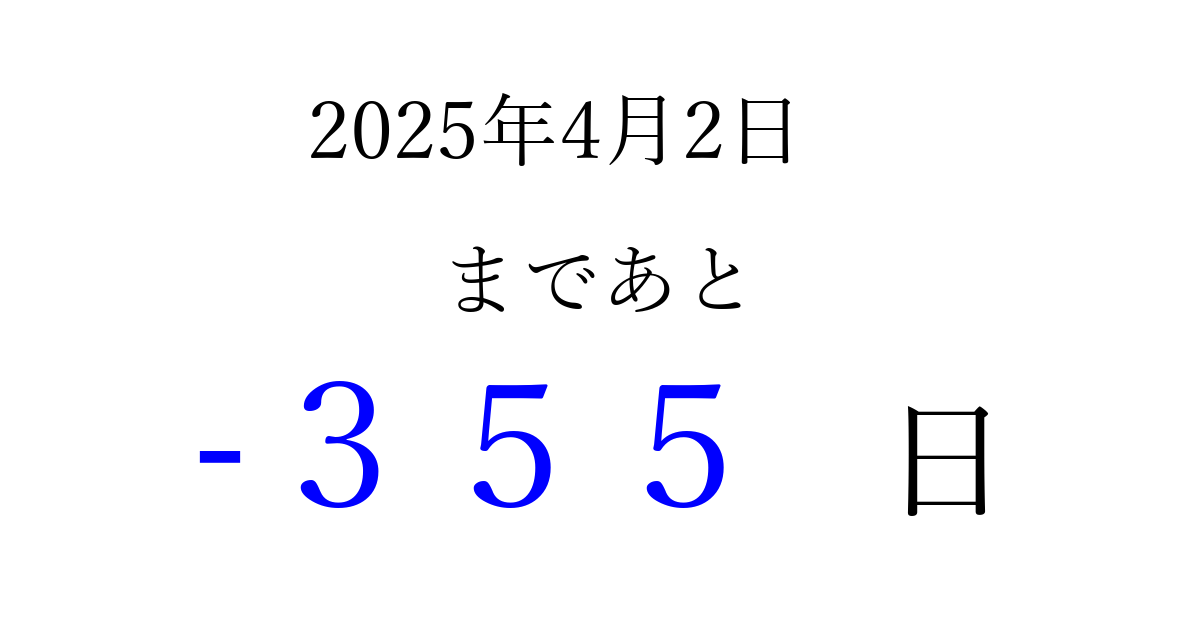 2025年4月2日(水)は もう 000 日過ぎました 追加すると、トップページからすぐ選べるようになります ※2026/03/23現在の結果です。 最新の状態に更新する ↓シェアして、タイムライン上にカウントダウンを表示しよう!↓ 📤 この結果を共有する Tweet シェア Threads Bluesky 別の日付でカウントダウン 2025年4月のカレンダー このページをブックマークに追加すると、いつでもカウントダウンを確認できます。 (PC: Ctrl+D / Mac: ⌘+D) hitome-notes.comでは以下のページも運営しています。 指定日と期間から日付を計算 | ガチャ確率計算・シミュレーション | プライバシー・ポリシー 運営者:Avocado