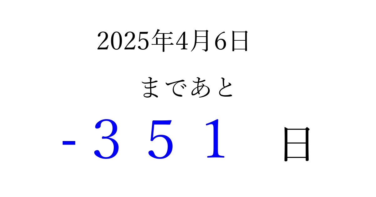 2025年4月6日(日)は もう 000 日過ぎました 追加すると、トップページからすぐ選べるようになります ※2026/03/23現在の結果です。 最新の状態に更新する ↓シェアして、タイムライン上にカウントダウンを表示しよう!↓ 📤 この結果を共有する Tweet シェア Threads Bluesky 別の日付でカウントダウン 2025年4月のカレンダー このページをブックマークに追加すると、いつでもカウントダウンを確認できます。 (PC: Ctrl+D / Mac: ⌘+D) hitome-notes.comでは以下のページも運営しています。 指定日と期間から日付を計算 | ガチャ確率計算・シミュレーション | プライバシー・ポリシー 運営者:Avocado
