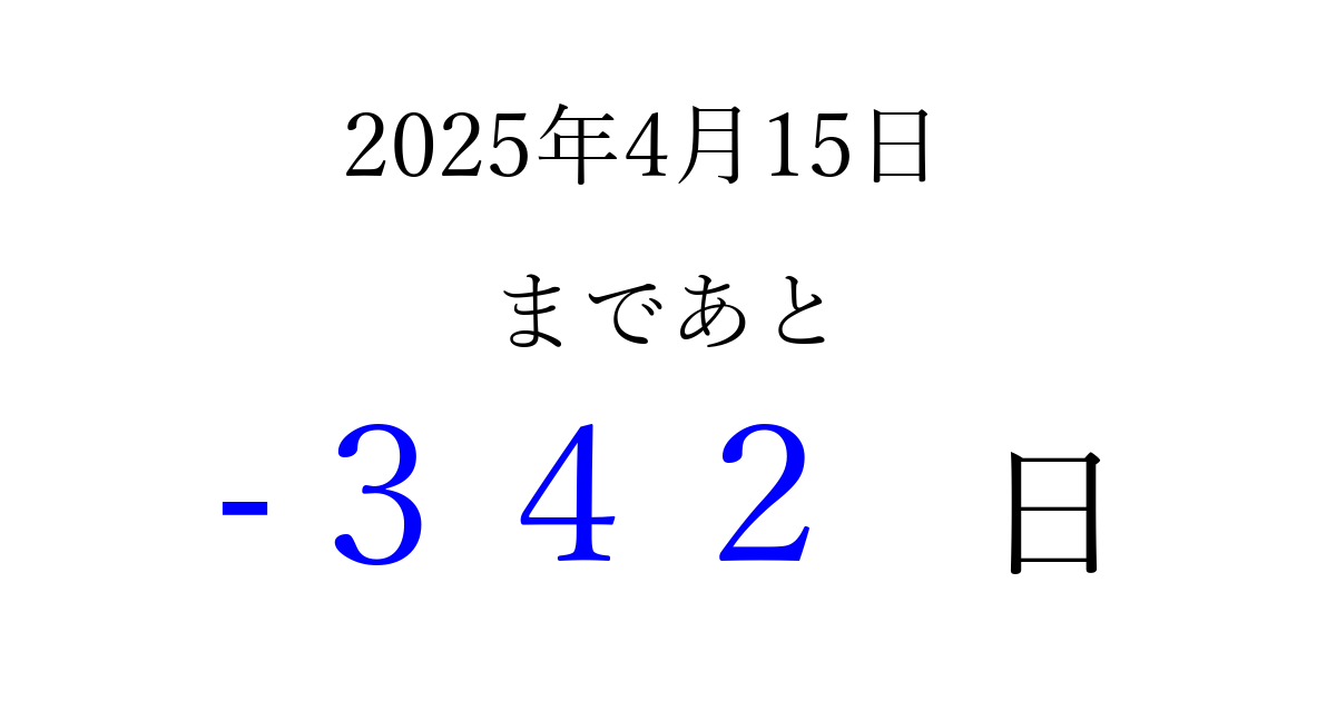 2025年4月15日(火)は もう 000 日過ぎました 追加すると、トップページからすぐ選べるようになります ※2026/03/23現在の結果です。 最新の状態に更新する ↓シェアして、タイムライン上にカウントダウンを表示しよう!↓ 📤 この結果を共有する Tweet シェア Threads Bluesky 別の日付でカウントダウン 2025年4月のカレンダー このページをブックマークに追加すると、いつでもカウントダウンを確認できます。 (PC: Ctrl+D / Mac: ⌘+D) hitome-notes.comでは以下のページも運営しています。 指定日と期間から日付を計算 | ガチャ確率計算・シミュレーション | プライバシー・ポリシー 運営者:Avocado