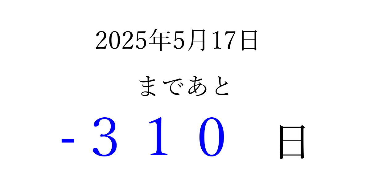 2025年5月17日(土)は もう 000 日過ぎました 追加すると、トップページからすぐ選べるようになります ※2026/03/23現在の結果です。 最新の状態に更新する ↓シェアして、タイムライン上にカウントダウンを表示しよう!↓ 📤 この結果を共有する Tweet シェア Threads Bluesky 別の日付でカウントダウン 2025年5月のカレンダー このページをブックマークに追加すると、いつでもカウントダウンを確認できます。 (PC: Ctrl+D / Mac: ⌘+D) hitome-notes.comでは以下のページも運営しています。 指定日と期間から日付を計算 | ガチャ確率計算・シミュレーション | プライバシー・ポリシー 運営者:Avocado