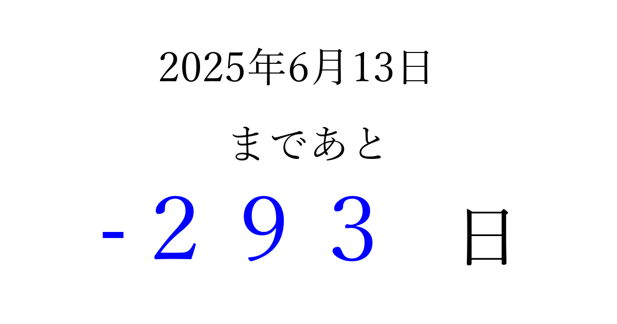 2025年6月13日(金)は もう 000 日過ぎました 追加すると、トップページからすぐ選べるようになります ※2026/04/02現在の結果です。 最新の状態に更新する ↓シェアして、タイムライン上にカウントダウンを表示しよう!↓ 📤 この結果を共有する Tweet シェア Threads Bluesky 別の日付でカウントダウン 2025年6月のカレンダー このページをブックマークに追加すると、いつでもカウントダウンを確認できます。 (PC: Ctrl+D / Mac: ⌘+D) hitome-notes.comでは以下のページも運営しています。 指定日と期間から日付を計算 | ガチャ確率計算・シミュレーション | プライバシー・ポリシー 運営者:Avocado