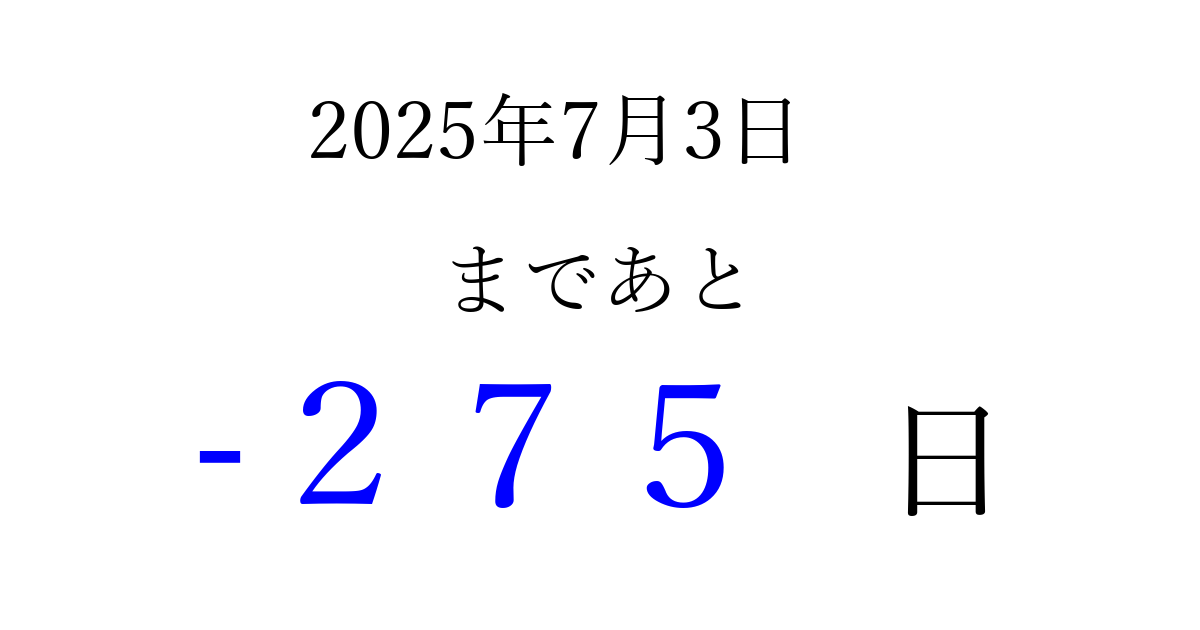 2025年7月3日(木)は もう 000 日過ぎました 追加すると、トップページからすぐ選べるようになります ※2026/04/04現在の結果です。 最新の状態に更新する ↓シェアして、タイムライン上にカウントダウンを表示しよう!↓ 📤 この結果を共有する Tweet シェア Threads Bluesky 別の日付でカウントダウン 2025年7月のカレンダー このページをブックマークに追加すると、いつでもカウントダウンを確認できます。 (PC: Ctrl+D / Mac: ⌘+D) hitome-notes.comでは以下のページも運営しています。 指定日と期間から日付を計算 | ガチャ確率計算・シミュレーション | プライバシー・ポリシー 運営者:Avocado