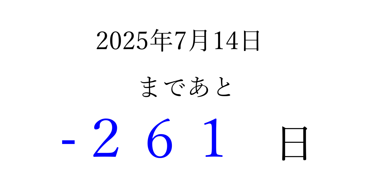 2025年7月14日(月)は もう 000 日過ぎました 追加すると、トップページからすぐ選べるようになります ※2026/04/01現在の結果です。 最新の状態に更新する ↓シェアして、タイムライン上にカウントダウンを表示しよう!↓ 📤 この結果を共有する Tweet シェア Threads Bluesky 別の日付でカウントダウン 2025年7月のカレンダー このページをブックマークに追加すると、いつでもカウントダウンを確認できます。 (PC: Ctrl+D / Mac: ⌘+D) hitome-notes.comでは以下のページも運営しています。 指定日と期間から日付を計算 | ガチャ確率計算・シミュレーション | プライバシー・ポリシー 運営者:Avocado