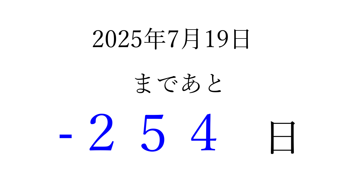 2025年7月19日(土)は もう 000 日過ぎました 追加すると、トップページからすぐ選べるようになります ※2026/03/30現在の結果です。 最新の状態に更新する ↓シェアして、タイムライン上にカウントダウンを表示しよう!↓ 📤 この結果を共有する Tweet シェア Threads Bluesky 別の日付でカウントダウン 2025年7月のカレンダー このページをブックマークに追加すると、いつでもカウントダウンを確認できます。 (PC: Ctrl+D / Mac: ⌘+D) hitome-notes.comでは以下のページも運営しています。 指定日と期間から日付を計算 | ガチャ確率計算・シミュレーション | プライバシー・ポリシー 運営者:Avocado