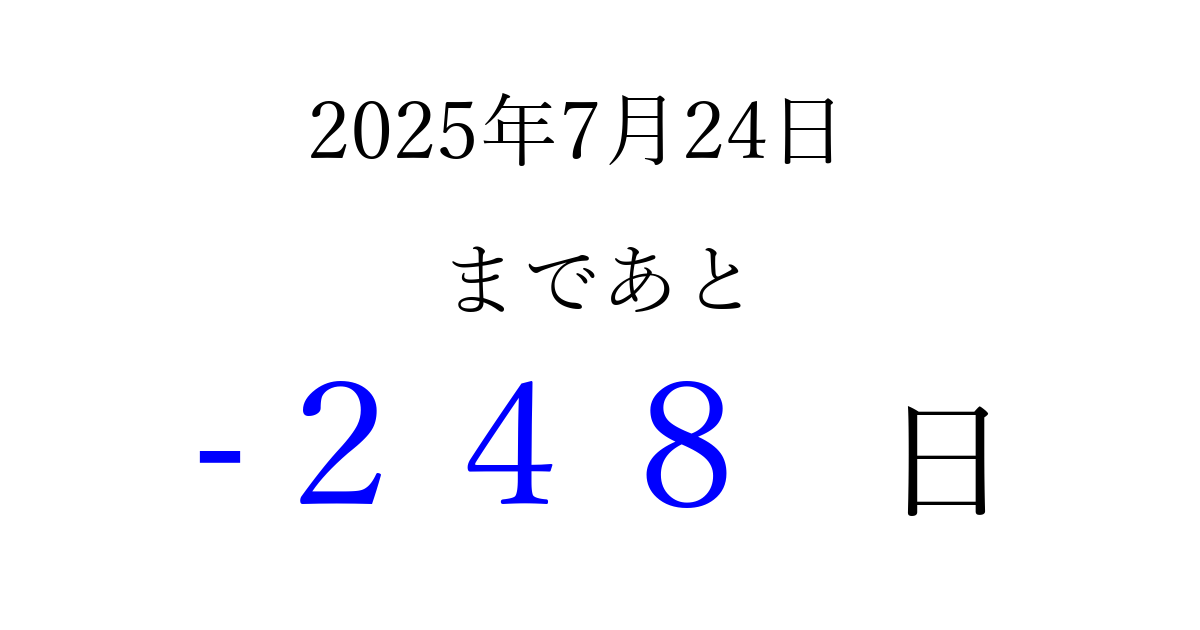 2025年7月24日(木)は もう 000 日過ぎました 追加すると、トップページからすぐ選べるようになります ※2026/03/29現在の結果です。 最新の状態に更新する ↓シェアして、タイムライン上にカウントダウンを表示しよう!↓ 📤 この結果を共有する Tweet シェア Threads Bluesky 別の日付でカウントダウン 2025年7月のカレンダー このページをブックマークに追加すると、いつでもカウントダウンを確認できます。 (PC: Ctrl+D / Mac: ⌘+D) hitome-notes.comでは以下のページも運営しています。 指定日と期間から日付を計算 | ガチャ確率計算・シミュレーション | プライバシー・ポリシー 運営者:Avocado