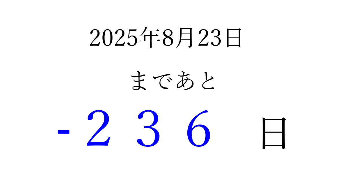 2025年8月23日(土)は もう 000 日過ぎました 追加すると、トップページからすぐ選べるようになります ※2026/04/16現在の結果です。 最新の状態に更新する ↓シェアして、タイムライン上にカウントダウンを表示しよう!↓ 📤 この結果を共有する Tweet シェア Threads Bluesky 別の日付でカウントダウン 2025年8月のカレンダー このページをブックマークに追加すると、いつでもカウントダウンを確認できます。 (PC: Ctrl+D / Mac: ⌘+D) hitome-notes.comでは以下のページも運営しています。 指定日と期間から日付を計算 | ガチャ確率計算・シミュレーション | プライバシー・ポリシー 運営者:Avocado