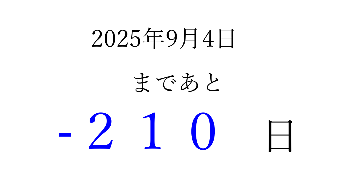 2025年9月4日(木)は もう 000 日過ぎました 追加すると、トップページからすぐ選べるようになります ※2026/04/02現在の結果です。 最新の状態に更新する ↓シェアして、タイムライン上にカウントダウンを表示しよう!↓ 📤 この結果を共有する Tweet シェア Threads Bluesky 別の日付でカウントダウン 2025年9月のカレンダー このページをブックマークに追加すると、いつでもカウントダウンを確認できます。 (PC: Ctrl+D / Mac: ⌘+D) hitome-notes.comでは以下のページも運営しています。 指定日と期間から日付を計算 | ガチャ確率計算・シミュレーション | プライバシー・ポリシー 運営者:Avocado