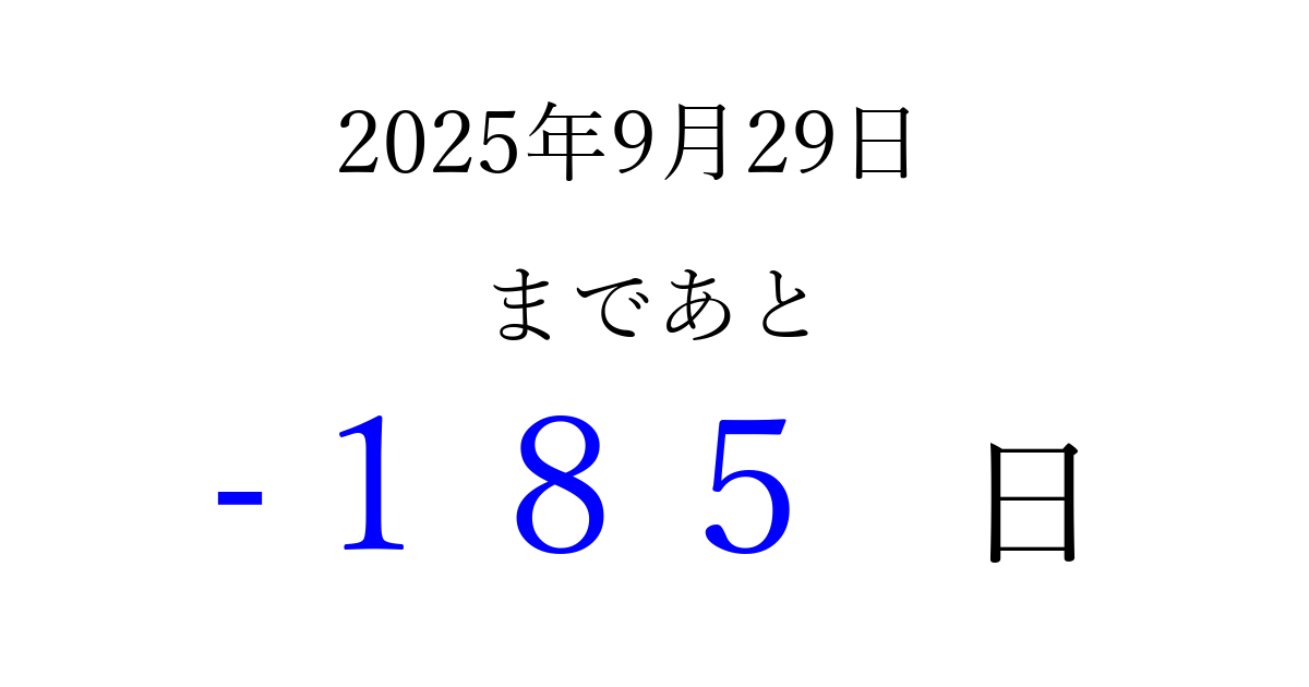2025年9月29日(月)は もう 000 日過ぎました 追加すると、トップページからすぐ選べるようになります ※2026/04/02現在の結果です。 最新の状態に更新する ↓シェアして、タイムライン上にカウントダウンを表示しよう!↓ 📤 この結果を共有する Tweet シェア Threads Bluesky 別の日付でカウントダウン 2025年9月のカレンダー このページをブックマークに追加すると、いつでもカウントダウンを確認できます。 (PC: Ctrl+D / Mac: ⌘+D) hitome-notes.comでは以下のページも運営しています。 指定日と期間から日付を計算 | ガチャ確率計算・シミュレーション | プライバシー・ポリシー 運営者:Avocado