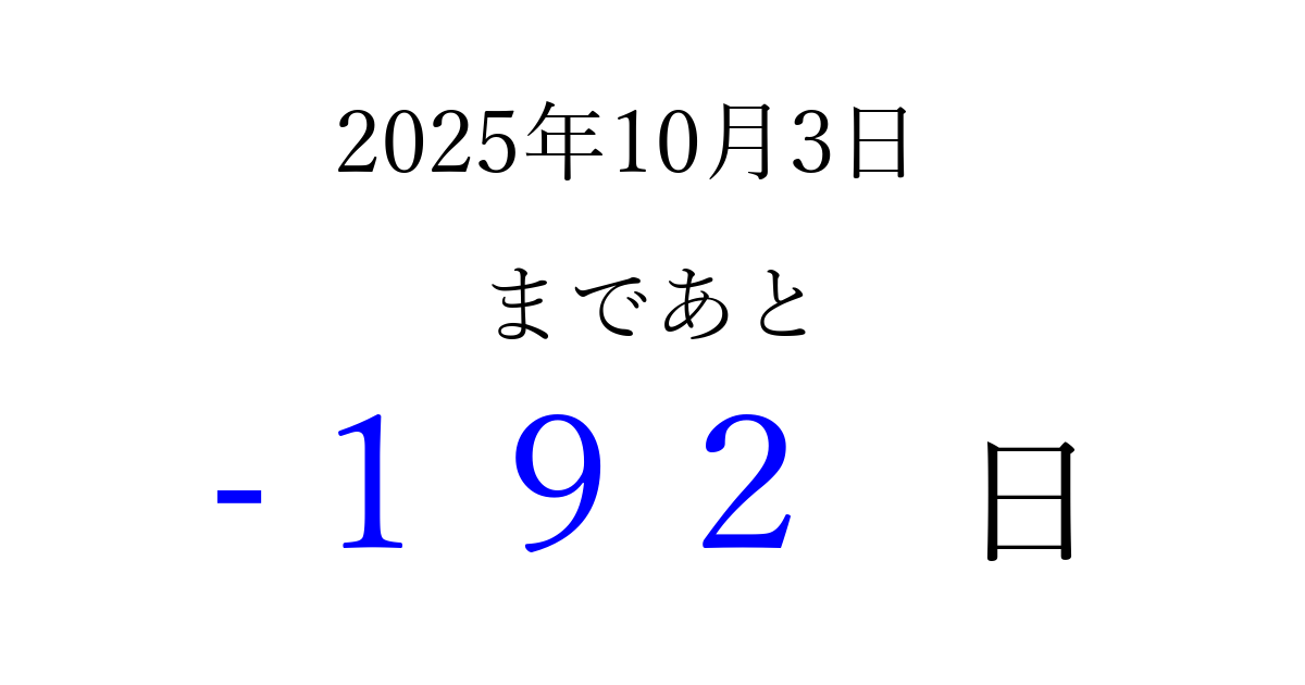 2025年10月3日(金)は もう 000 日過ぎました 追加すると、トップページからすぐ選べるようになります ※2026/04/13現在の結果です。 最新の状態に更新する ↓シェアして、タイムライン上にカウントダウンを表示しよう!↓ 📤 この結果を共有する Tweet シェア Threads Bluesky 別の日付でカウントダウン 2025年10月のカレンダー このページをブックマークに追加すると、いつでもカウントダウンを確認できます。 (PC: Ctrl+D / Mac: ⌘+D) hitome-notes.comでは以下のページも運営しています。 指定日と期間から日付を計算 | ガチャ確率計算・シミュレーション | プライバシー・ポリシー 運営者:Avocado