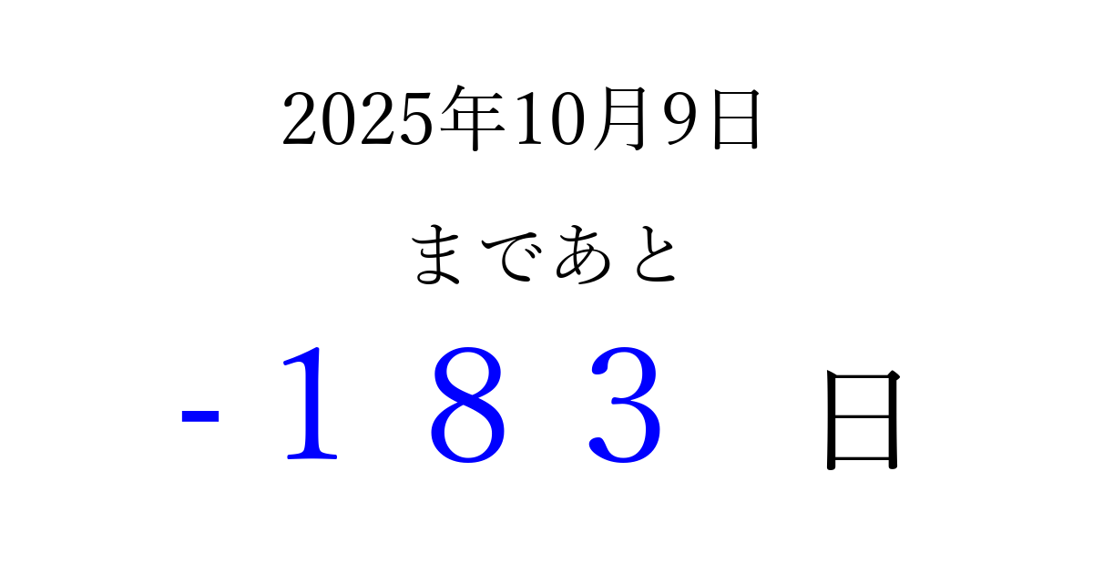 2025年10月9日(木)は もう 000 日過ぎました 追加すると、トップページからすぐ選べるようになります ※2026/04/10現在の結果です。 最新の状態に更新する ↓シェアして、タイムライン上にカウントダウンを表示しよう!↓ 📤 この結果を共有する Tweet シェア Threads Bluesky 別の日付でカウントダウン 2025年10月のカレンダー このページをブックマークに追加すると、いつでもカウントダウンを確認できます。 (PC: Ctrl+D / Mac: ⌘+D) hitome-notes.comでは以下のページも運営しています。 指定日と期間から日付を計算 | ガチャ確率計算・シミュレーション | プライバシー・ポリシー 運営者:Avocado