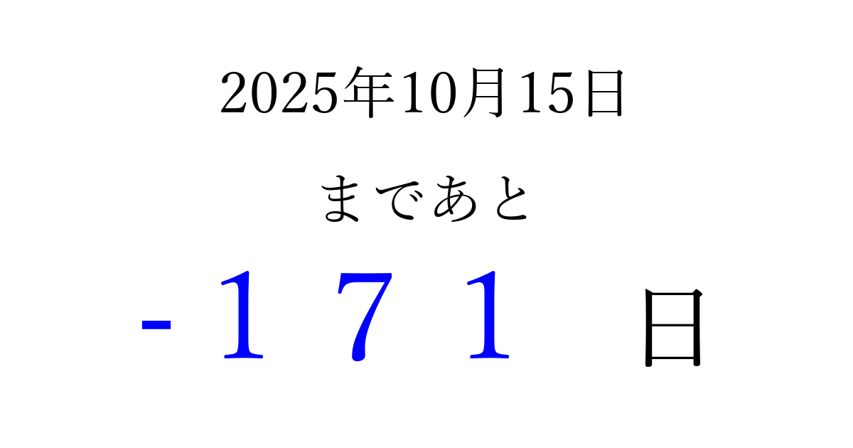 2025年10月15日(水)は もう 000 日過ぎました 追加すると、トップページからすぐ選べるようになります ※2026/04/04現在の結果です。 最新の状態に更新する ↓シェアして、タイムライン上にカウントダウンを表示しよう!↓ 📤 この結果を共有する Tweet シェア Threads Bluesky 別の日付でカウントダウン 2025年10月のカレンダー このページをブックマークに追加すると、いつでもカウントダウンを確認できます。 (PC: Ctrl+D / Mac: ⌘+D) hitome-notes.comでは以下のページも運営しています。 指定日と期間から日付を計算 | ガチャ確率計算・シミュレーション | プライバシー・ポリシー 運営者:Avocado