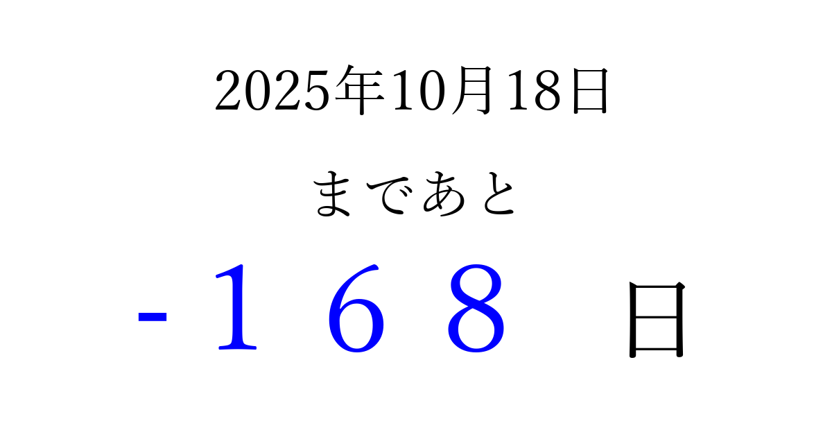 2025年10月18日(土)は もう 000 日過ぎました 追加すると、トップページからすぐ選べるようになります ※2026/04/04現在の結果です。 最新の状態に更新する ↓シェアして、タイムライン上にカウントダウンを表示しよう!↓ 📤 この結果を共有する Tweet シェア Threads Bluesky 別の日付でカウントダウン 2025年10月のカレンダー このページをブックマークに追加すると、いつでもカウントダウンを確認できます。 (PC: Ctrl+D / Mac: ⌘+D) hitome-notes.comでは以下のページも運営しています。 指定日と期間から日付を計算 | ガチャ確率計算・シミュレーション | プライバシー・ポリシー 運営者:Avocado