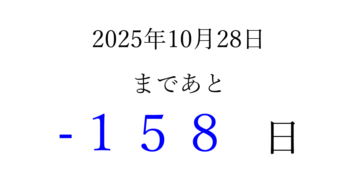 2025年10月28日(火)は もう 000 日過ぎました 追加すると、トップページからすぐ選べるようになります ※2026/04/04現在の結果です。 最新の状態に更新する ↓シェアして、タイムライン上にカウントダウンを表示しよう!↓ 📤 この結果を共有する Tweet シェア Threads Bluesky 別の日付でカウントダウン 2025年10月のカレンダー このページをブックマークに追加すると、いつでもカウントダウンを確認できます。 (PC: Ctrl+D / Mac: ⌘+D) hitome-notes.comでは以下のページも運営しています。 指定日と期間から日付を計算 | ガチャ確率計算・シミュレーション | プライバシー・ポリシー 運営者:Avocado