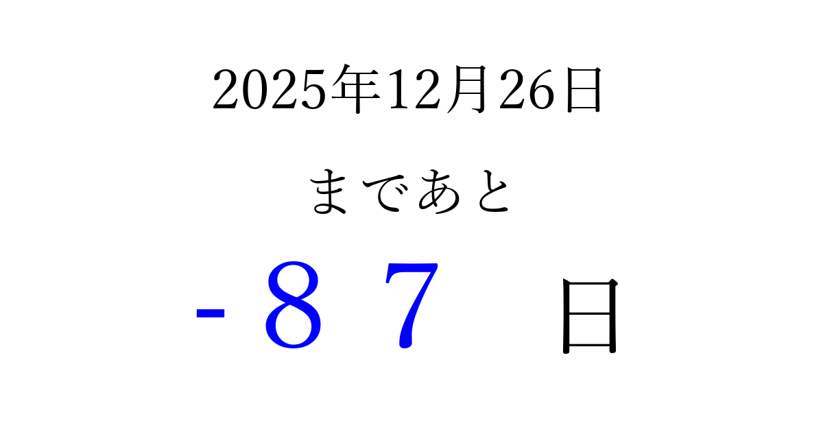 2025年12月26日(金)は もう 00 日過ぎました 追加すると、トップページからすぐ選べるようになります ※2026/03/23現在の結果です。 最新の状態に更新する ↓シェアして、タイムライン上にカウントダウンを表示しよう!↓ 📤 この結果を共有する Tweet シェア Threads Bluesky 別の日付でカウントダウン 2025年12月のカレンダー このページをブックマークに追加すると、いつでもカウントダウンを確認できます。 (PC: Ctrl+D / Mac: ⌘+D) hitome-notes.comでは以下のページも運営しています。 指定日と期間から日付を計算 | ガチャ確率計算・シミュレーション | プライバシー・ポリシー 運営者:Avocado