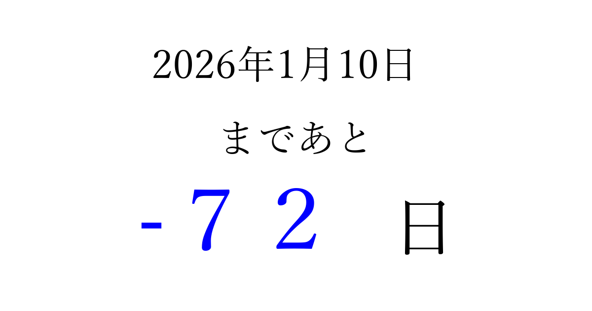 2026年1月10日(土)は もう 00 日過ぎました 追加すると、トップページからすぐ選べるようになります ※2026/03/23現在の結果です。 最新の状態に更新する ↓シェアして、タイムライン上にカウントダウンを表示しよう!↓ 📤 この結果を共有する Tweet シェア Threads Bluesky 別の日付でカウントダウン 2026年1月のカレンダー このページをブックマークに追加すると、いつでもカウントダウンを確認できます。 (PC: Ctrl+D / Mac: ⌘+D) hitome-notes.comでは以下のページも運営しています。 指定日と期間から日付を計算 | ガチャ確率計算・シミュレーション | プライバシー・ポリシー 運営者:Avocado
