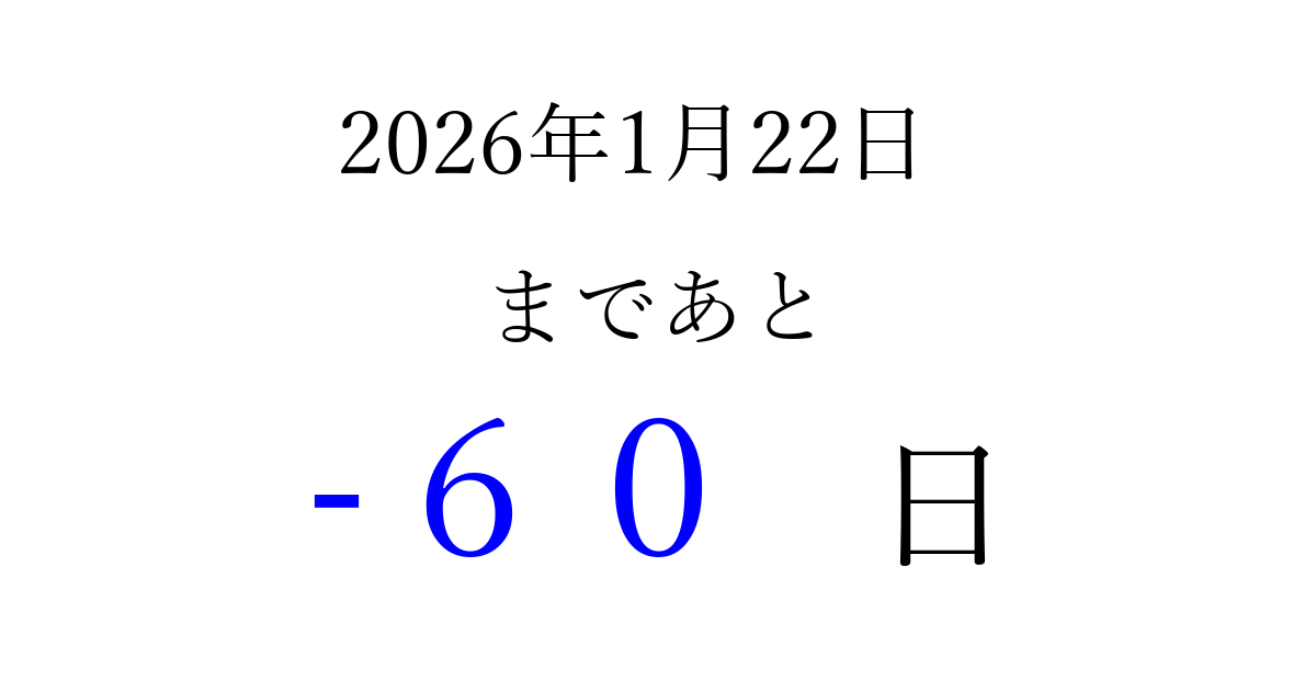 2026年1月22日(木)は もう 00 日過ぎました 追加すると、トップページからすぐ選べるようになります ※2026/03/23現在の結果です。 最新の状態に更新する ↓シェアして、タイムライン上にカウントダウンを表示しよう!↓ 📤 この結果を共有する Tweet シェア Threads Bluesky 別の日付でカウントダウン 2026年1月のカレンダー このページをブックマークに追加すると、いつでもカウントダウンを確認できます。 (PC: Ctrl+D / Mac: ⌘+D) hitome-notes.comでは以下のページも運営しています。 指定日と期間から日付を計算 | ガチャ確率計算・シミュレーション | プライバシー・ポリシー 運営者:Avocado