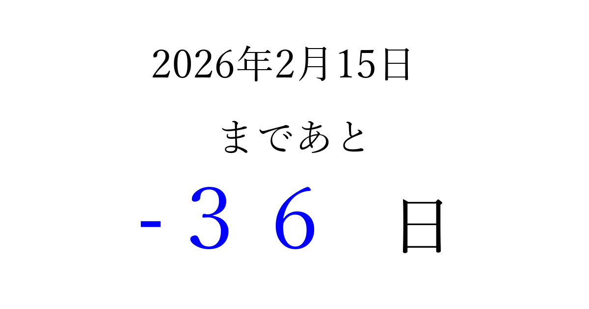 2026年2月15日(日)は もう 00 日過ぎました 追加すると、トップページからすぐ選べるようになります ※2026/03/23現在の結果です。 最新の状態に更新する ↓シェアして、タイムライン上にカウントダウンを表示しよう!↓ 📤 この結果を共有する Tweet シェア Threads Bluesky 別の日付でカウントダウン 2026年2月のカレンダー このページをブックマークに追加すると、いつでもカウントダウンを確認できます。 (PC: Ctrl+D / Mac: ⌘+D) hitome-notes.comでは以下のページも運営しています。 指定日と期間から日付を計算 | ガチャ確率計算・シミュレーション | プライバシー・ポリシー 運営者:Avocado