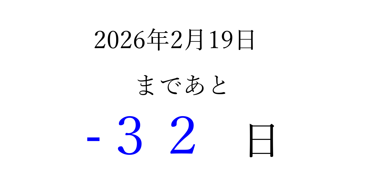 2026年2月19日(木)は もう 00 日過ぎました 追加すると、トップページからすぐ選べるようになります ※2026/03/23現在の結果です。 最新の状態に更新する ↓シェアして、タイムライン上にカウントダウンを表示しよう!↓ 📤 この結果を共有する Tweet シェア Threads Bluesky 別の日付でカウントダウン 2026年2月のカレンダー このページをブックマークに追加すると、いつでもカウントダウンを確認できます。 (PC: Ctrl+D / Mac: ⌘+D) hitome-notes.comでは以下のページも運営しています。 指定日と期間から日付を計算 | ガチャ確率計算・シミュレーション | プライバシー・ポリシー 運営者:Avocado