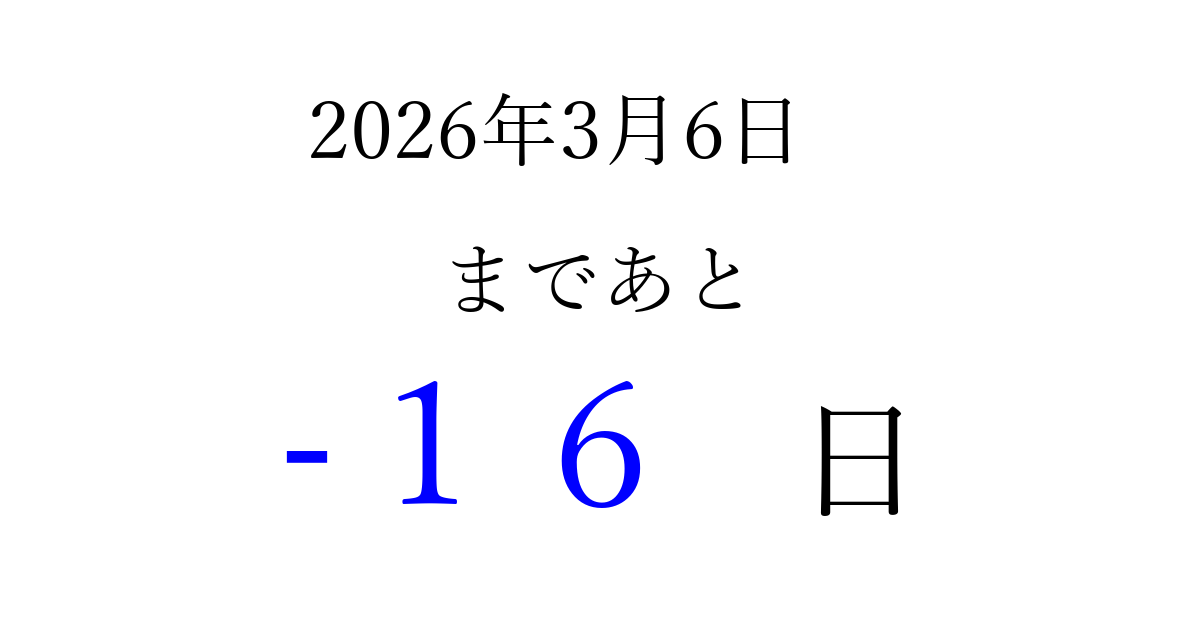 2026年3月6日(金)は もう 00 日過ぎました 追加すると、トップページからすぐ選べるようになります ※2026/03/22現在の結果です。 最新の状態に更新する ↓シェアして、タイムライン上にカウントダウンを表示しよう!↓ 📤 この結果を共有する Tweet シェア Threads Bluesky 別の日付でカウントダウン 2026年3月のカレンダー このページをブックマークに追加すると、いつでもカウントダウンを確認できます。 (PC: Ctrl+D / Mac: ⌘+D) hitome-notes.comでは以下のページも運営しています。 指定日と期間から日付を計算 | ガチャ確率計算・シミュレーション | プライバシー・ポリシー 運営者:Avocado