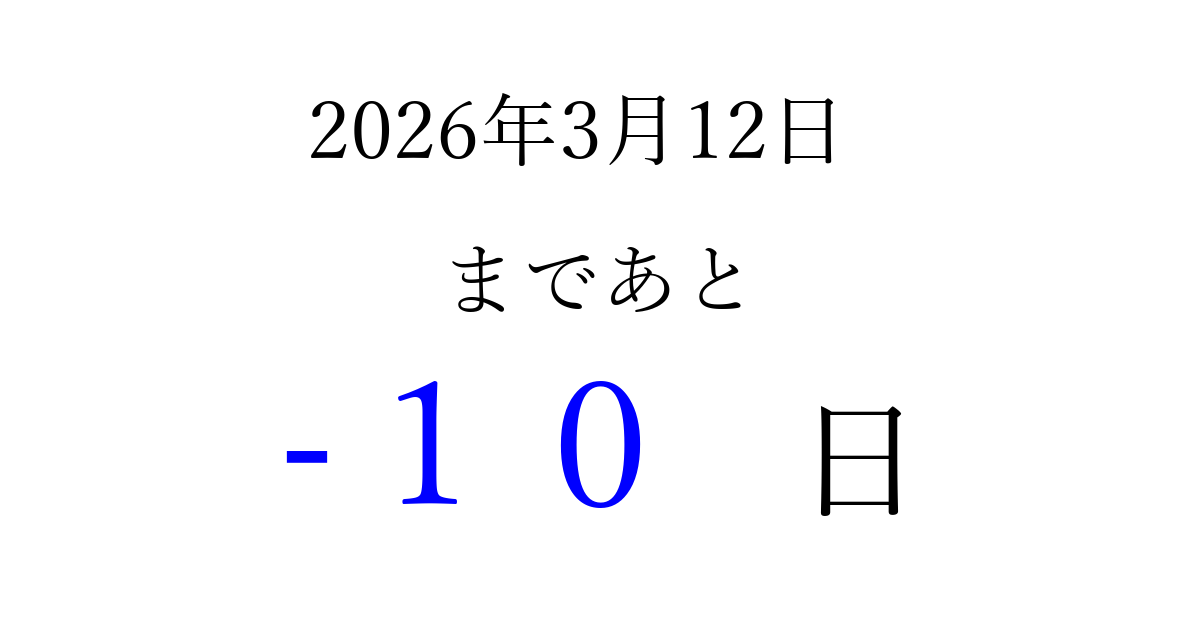 2026年3月12日(木)は もう 00 日過ぎました 追加すると、トップページからすぐ選べるようになります ※2026/03/22現在の結果です。 最新の状態に更新する ↓シェアして、タイムライン上にカウントダウンを表示しよう!↓ 📤 この結果を共有する Tweet シェア Threads Bluesky 別の日付でカウントダウン 2026年3月のカレンダー このページをブックマークに追加すると、いつでもカウントダウンを確認できます。 (PC: Ctrl+D / Mac: ⌘+D) hitome-notes.comでは以下のページも運営しています。 指定日と期間から日付を計算 | ガチャ確率計算・シミュレーション | プライバシー・ポリシー 運営者:Avocado