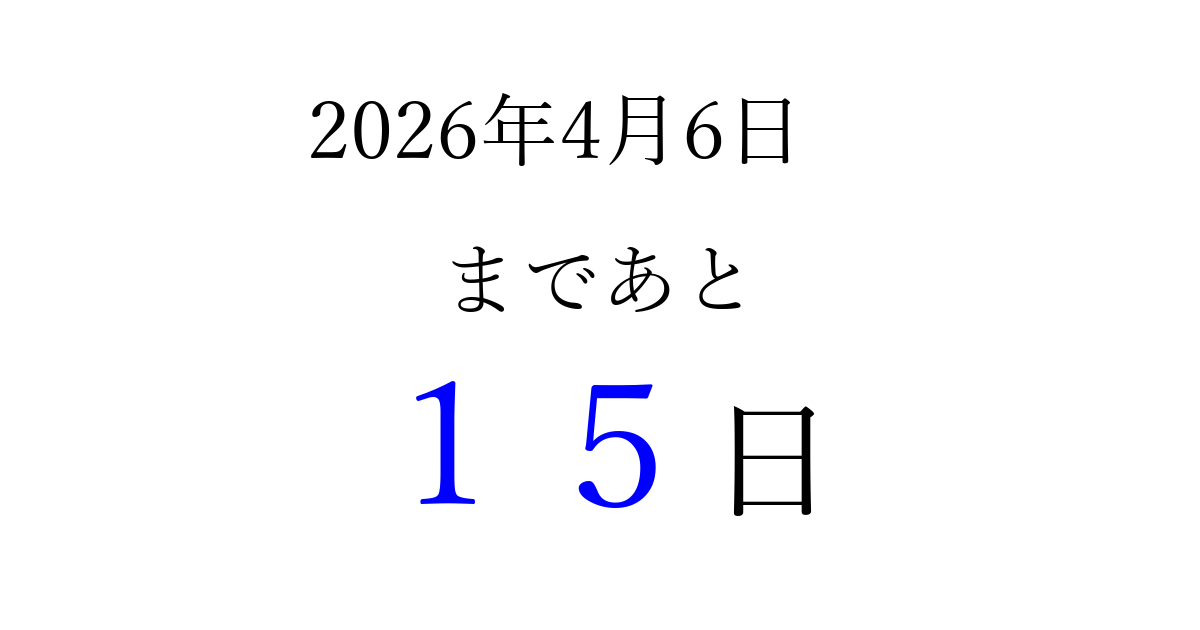 2026年4月6日(月)まで あと 99 日です 追加すると、トップページからすぐ選べるようになります ※2026/03/22現在の結果です。 最新の状態に更新する ↓シェアして、タイムライン上にカウントダウンを表示しよう!↓ 📤 この結果を共有する Tweet シェア Threads Bluesky 別の日付でカウントダウン 2026年4月のカレンダー このページをブックマークに追加すると、いつでもカウントダウンを確認できます。 (PC: Ctrl+D / Mac: ⌘+D) hitome-notes.comでは以下のページも運営しています。 指定日と期間から日付を計算 | ガチャ確率計算・シミュレーション | プライバシー・ポリシー 運営者:Avocado