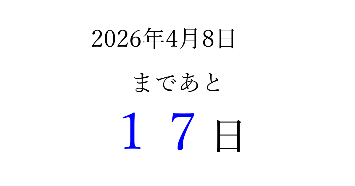 2026年4月8日(水)まで あと 99 日です 追加すると、トップページからすぐ選べるようになります ※2026/03/22現在の結果です。 最新の状態に更新する ↓シェアして、タイムライン上にカウントダウンを表示しよう!↓ 📤 この結果を共有する Tweet シェア Threads Bluesky 別の日付でカウントダウン 2026年4月のカレンダー このページをブックマークに追加すると、いつでもカウントダウンを確認できます。 (PC: Ctrl+D / Mac: ⌘+D) hitome-notes.comでは以下のページも運営しています。 指定日と期間から日付を計算 | ガチャ確率計算・シミュレーション | プライバシー・ポリシー 運営者:Avocado