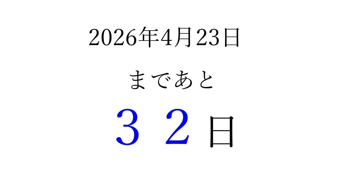 2026年4月23日(木)まで あと 99 日です 追加すると、トップページからすぐ選べるようになります ※2026/03/22現在の結果です。 最新の状態に更新する ↓シェアして、タイムライン上にカウントダウンを表示しよう!↓ 📤 この結果を共有する Tweet シェア Threads Bluesky 別の日付でカウントダウン 2026年4月のカレンダー このページをブックマークに追加すると、いつでもカウントダウンを確認できます。 (PC: Ctrl+D / Mac: ⌘+D) hitome-notes.comでは以下のページも運営しています。 指定日と期間から日付を計算 | ガチャ確率計算・シミュレーション | プライバシー・ポリシー 運営者:Avocado