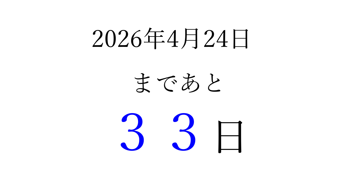 2026年4月24日(金)まで あと 99 日です 追加すると、トップページからすぐ選べるようになります ※2026/03/22現在の結果です。 最新の状態に更新する ↓シェアして、タイムライン上にカウントダウンを表示しよう!↓ 📤 この結果を共有する Tweet シェア Threads Bluesky 別の日付でカウントダウン 2026年4月のカレンダー このページをブックマークに追加すると、いつでもカウントダウンを確認できます。 (PC: Ctrl+D / Mac: ⌘+D) hitome-notes.comでは以下のページも運営しています。 指定日と期間から日付を計算 | ガチャ確率計算・シミュレーション | プライバシー・ポリシー 運営者:Avocado