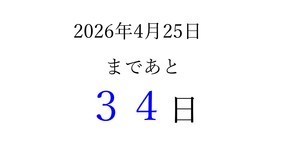2026年4月25日(土)まで あと 99 日です 追加すると、トップページからすぐ選べるようになります ※2026/03/22現在の結果です。 最新の状態に更新する ↓シェアして、タイムライン上にカウントダウンを表示しよう!↓ 📤 この結果を共有する Tweet シェア Threads Bluesky 別の日付でカウントダウン 2026年4月のカレンダー このページをブックマークに追加すると、いつでもカウントダウンを確認できます。 (PC: Ctrl+D / Mac: ⌘+D) hitome-notes.comでは以下のページも運営しています。 指定日と期間から日付を計算 | ガチャ確率計算・シミュレーション | プライバシー・ポリシー 運営者:Avocado