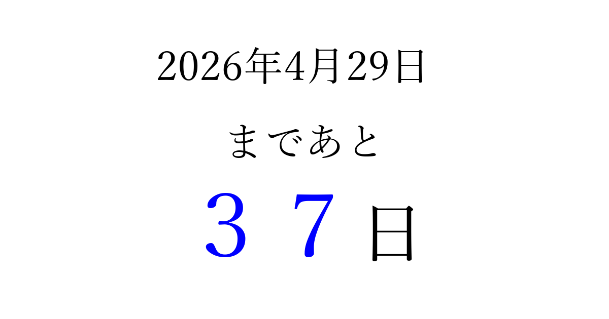 2026年4月29日(水)まで あと 99 日です 追加すると、トップページからすぐ選べるようになります ※2026/03/23現在の結果です。 最新の状態に更新する ↓シェアして、タイムライン上にカウントダウンを表示しよう!↓ 📤 この結果を共有する Tweet シェア Threads Bluesky 別の日付でカウントダウン 2026年4月のカレンダー このページをブックマークに追加すると、いつでもカウントダウンを確認できます。 (PC: Ctrl+D / Mac: ⌘+D) hitome-notes.comでは以下のページも運営しています。 指定日と期間から日付を計算 | ガチャ確率計算・シミュレーション | プライバシー・ポリシー 運営者:Avocado