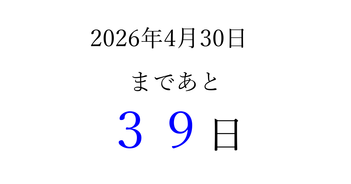 2026年4月30日(木)まで あと 99 日です 追加すると、トップページからすぐ選べるようになります ※2026/03/22現在の結果です。 最新の状態に更新する ↓シェアして、タイムライン上にカウントダウンを表示しよう!↓ 📤 この結果を共有する Tweet シェア Threads Bluesky 別の日付でカウントダウン 2026年4月のカレンダー このページをブックマークに追加すると、いつでもカウントダウンを確認できます。 (PC: Ctrl+D / Mac: ⌘+D) hitome-notes.comでは以下のページも運営しています。 指定日と期間から日付を計算 | ガチャ確率計算・シミュレーション | プライバシー・ポリシー 運営者:Avocado