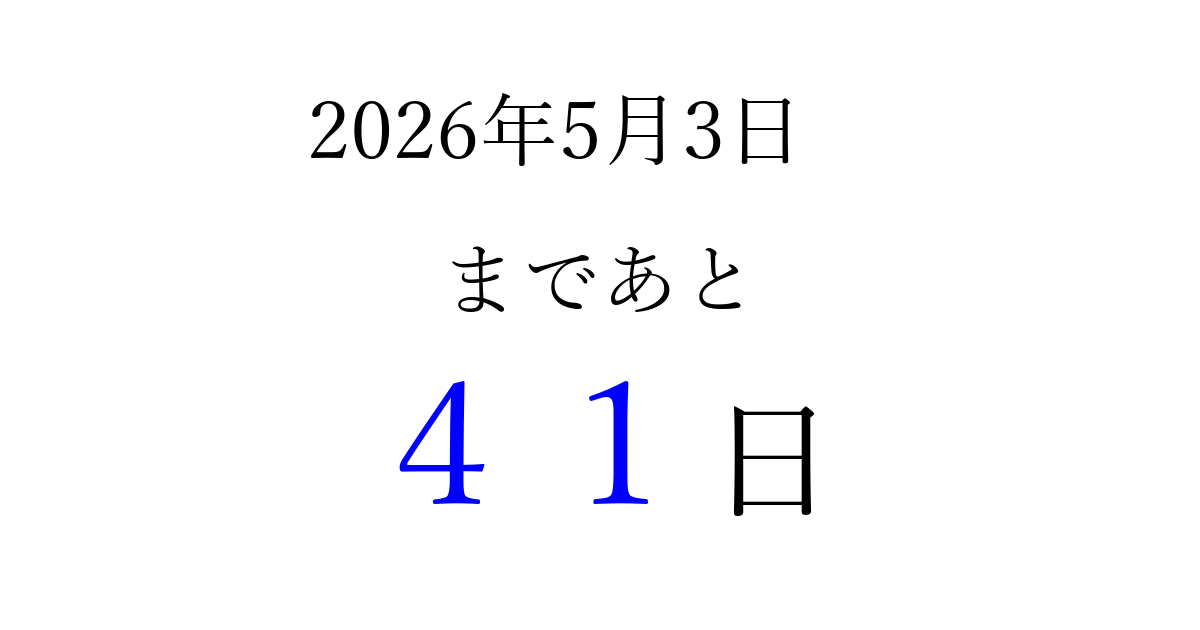 2026年5月3日(日)まで あと 99 日です 追加すると、トップページからすぐ選べるようになります ※2026/03/23現在の結果です。 最新の状態に更新する ↓シェアして、タイムライン上にカウントダウンを表示しよう!↓ 📤 この結果を共有する Tweet シェア Threads Bluesky 別の日付でカウントダウン 2026年5月のカレンダー このページをブックマークに追加すると、いつでもカウントダウンを確認できます。 (PC: Ctrl+D / Mac: ⌘+D) hitome-notes.comでは以下のページも運営しています。 指定日と期間から日付を計算 | ガチャ確率計算・シミュレーション | プライバシー・ポリシー 運営者:Avocado