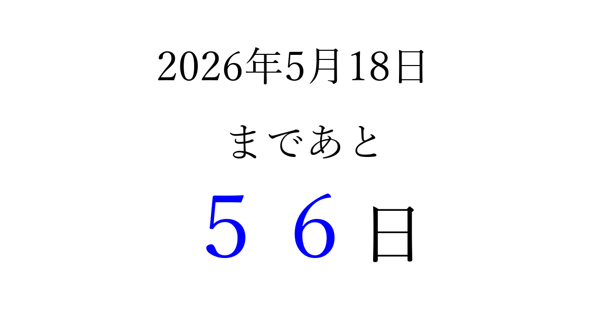 2026年5月18日(月)まで あと 99 日です 追加すると、トップページからすぐ選べるようになります ※2026/03/23現在の結果です。 最新の状態に更新する ↓シェアして、タイムライン上にカウントダウンを表示しよう!↓ 📤 この結果を共有する Tweet シェア Threads Bluesky 別の日付でカウントダウン 2026年5月のカレンダー このページをブックマークに追加すると、いつでもカウントダウンを確認できます。 (PC: Ctrl+D / Mac: ⌘+D) hitome-notes.comでは以下のページも運営しています。 指定日と期間から日付を計算 | ガチャ確率計算・シミュレーション | プライバシー・ポリシー 運営者:Avocado