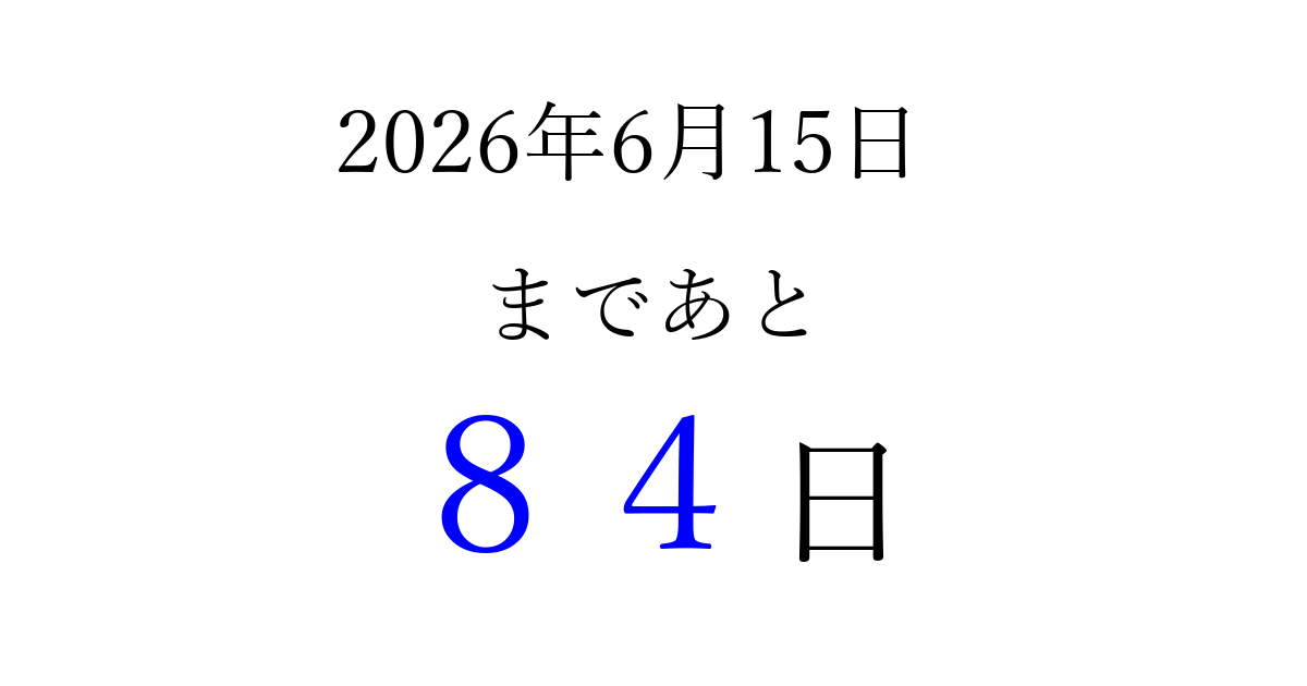 2026年6月15日(月)まで あと 99 日です 追加すると、トップページからすぐ選べるようになります ※2026/03/23現在の結果です。 最新の状態に更新する ↓シェアして、タイムライン上にカウントダウンを表示しよう!↓ 📤 この結果を共有する Tweet シェア Threads Bluesky 別の日付でカウントダウン 2026年6月のカレンダー このページをブックマークに追加すると、いつでもカウントダウンを確認できます。 (PC: Ctrl+D / Mac: ⌘+D) hitome-notes.comでは以下のページも運営しています。 指定日と期間から日付を計算 | ガチャ確率計算・シミュレーション | プライバシー・ポリシー 運営者:Avocado