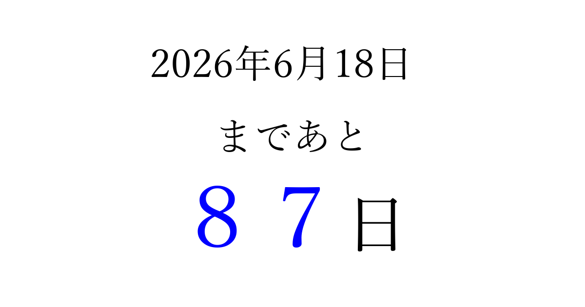 2026年6月18日(木)まで あと 99 日です 追加すると、トップページからすぐ選べるようになります ※2026/03/23現在の結果です。 最新の状態に更新する ↓シェアして、タイムライン上にカウントダウンを表示しよう!↓ 📤 この結果を共有する Tweet シェア Threads Bluesky 別の日付でカウントダウン 2026年6月のカレンダー このページをブックマークに追加すると、いつでもカウントダウンを確認できます。 (PC: Ctrl+D / Mac: ⌘+D) hitome-notes.comでは以下のページも運営しています。 指定日と期間から日付を計算 | ガチャ確率計算・シミュレーション | プライバシー・ポリシー 運営者:Avocado